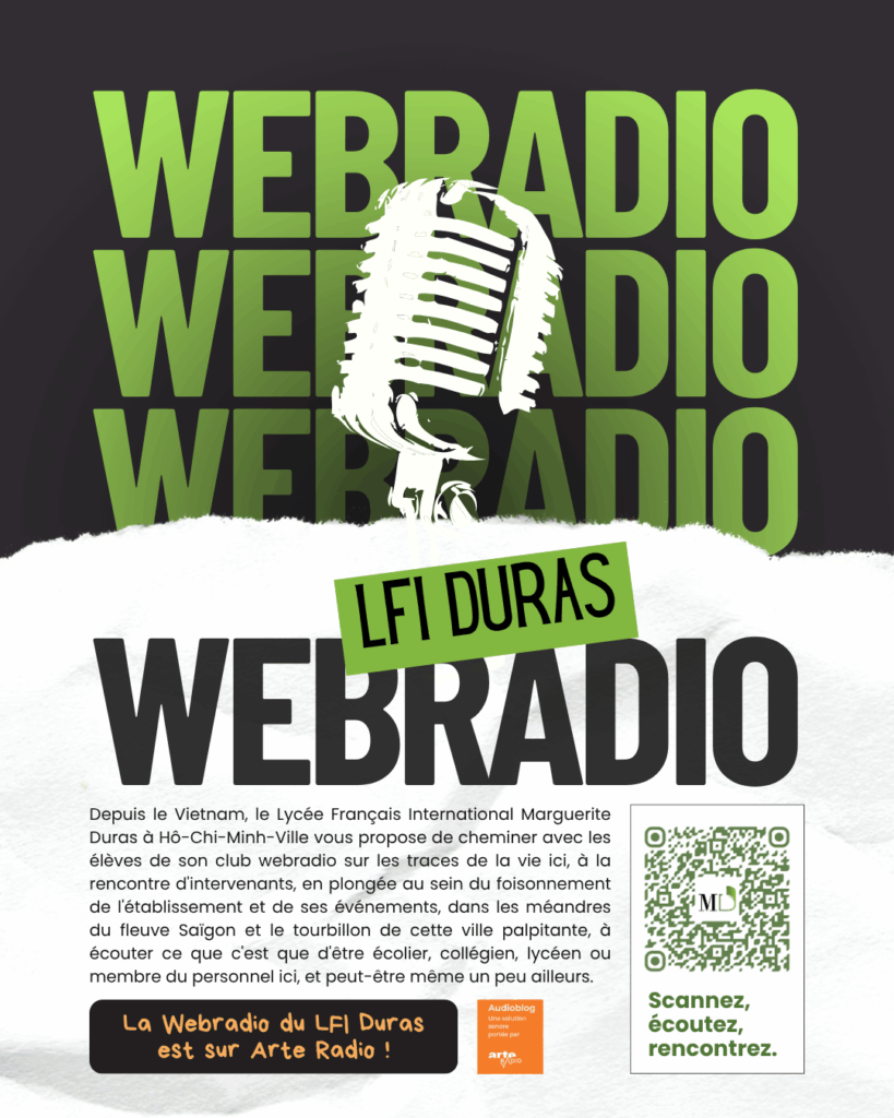 Depuis le Vietnam, le Lycée Français International Marguerite Duras à Hô-Chi-Minh-Ville vous propose de cheminer avec les élèves de son club webradio sur les traces de la vie ici, à la rencontre d’intervenants, en plongée au sein du foisonnement de l’établissement et de ses événements, dans les méandres du fleuve Saïgon et le tourbillon de cette ville palpitante, à écouter ce que c’est que d’être écolier, collégien, lycéen ou membre du personnel ici, et peut-être même un peu ailleurs.