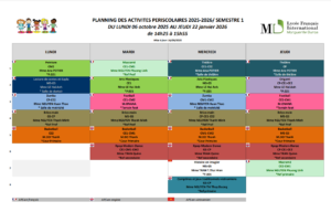 Vous trouverez ci-dessous le planning des activités périscolaires du 1er semestre, du 6 octobre 2025 au 23 janvier 2026.