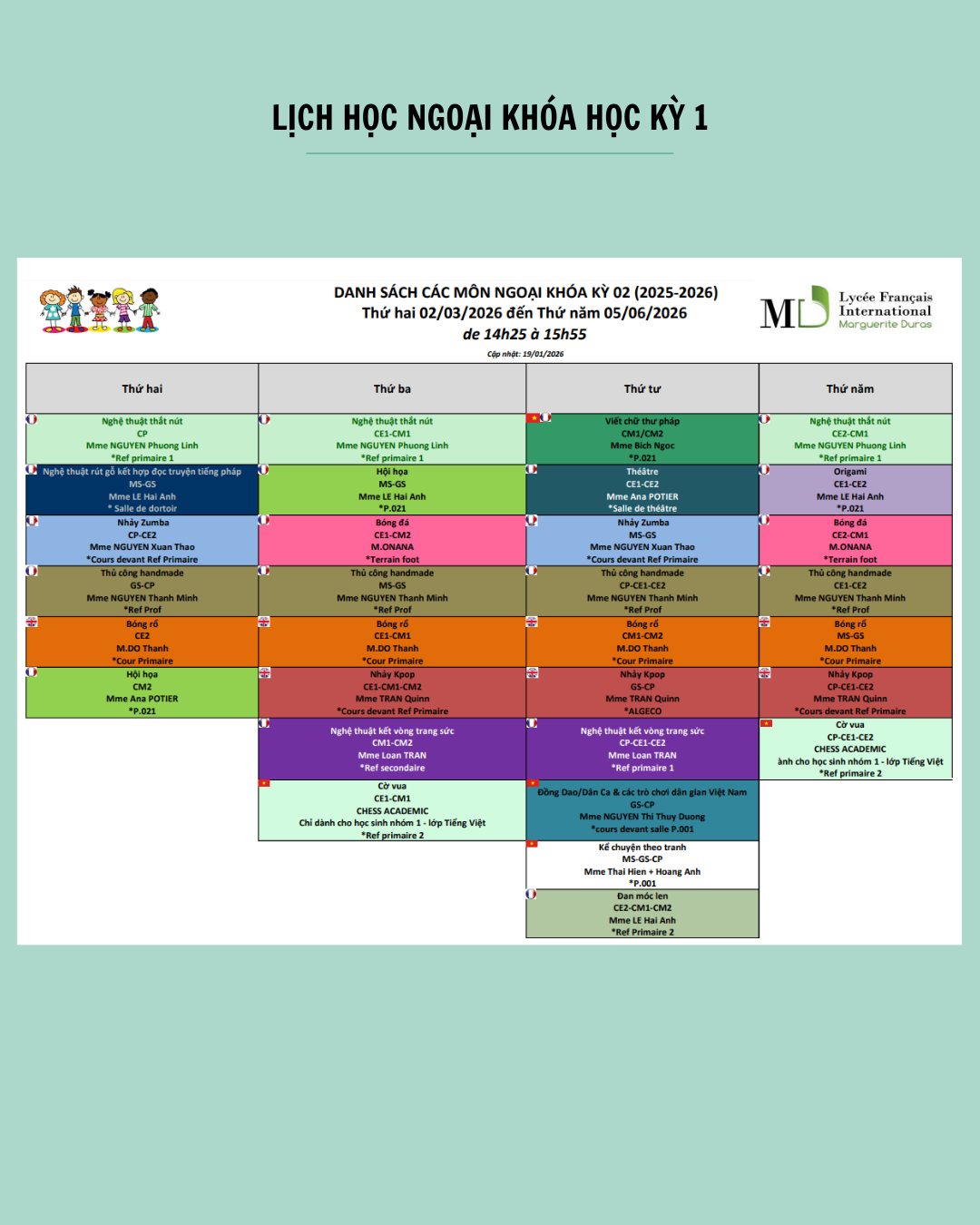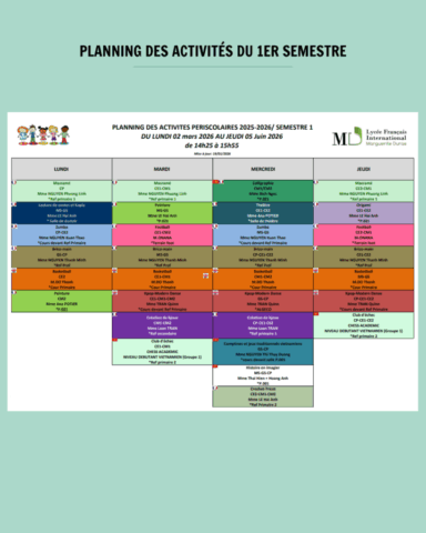 Vous trouverez ci-dessous le planning des activités périscolaires du 2eme semestre, du lundi 2 mars 2026 au jeudi 4 juin 2026 :