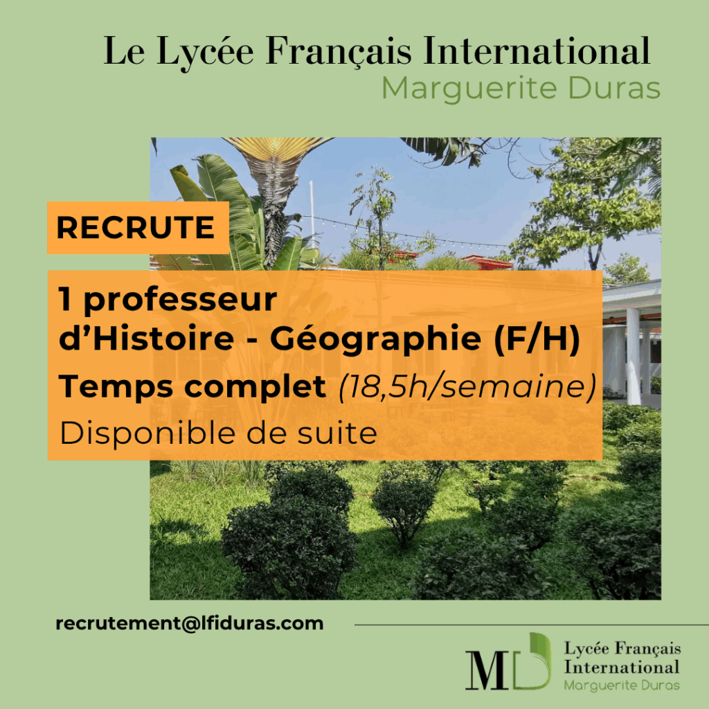 Le Lycée Français International Duras recrute un(e) professeur(e) d’Histoire – Géographie à temps complet pour un remplacement sur l’année scolaire 2025- 2026.
