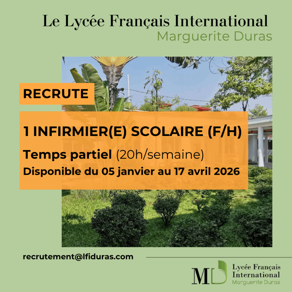 Le Lycée Français International Duras  recherche un(e) infirmier(ère) scolaire à mi-temps (20h hebdomadaires), en remplacement du 5 janvier au 17 avril 2026.