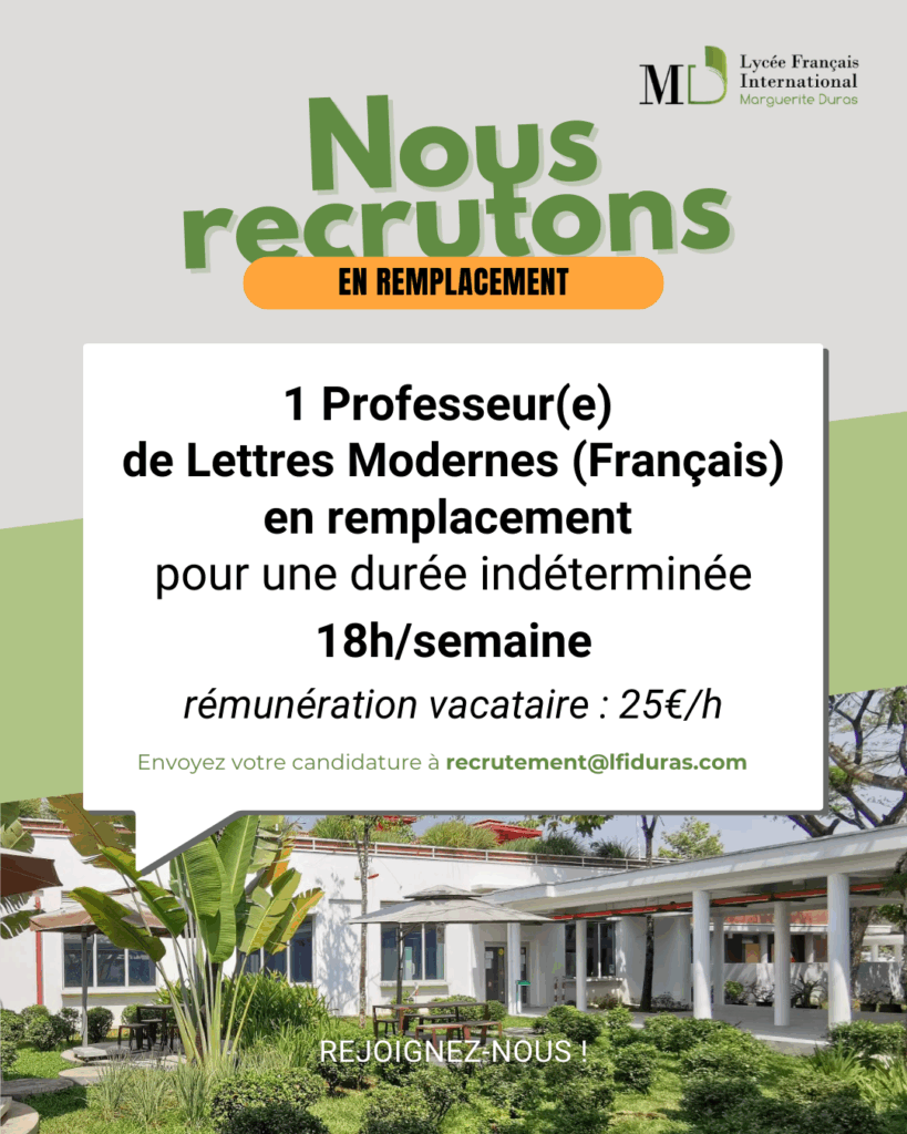 Le lycée français international Marguerite Duras recherche des vacataires pour des remplacements de professeurs des écoles (1er degré).